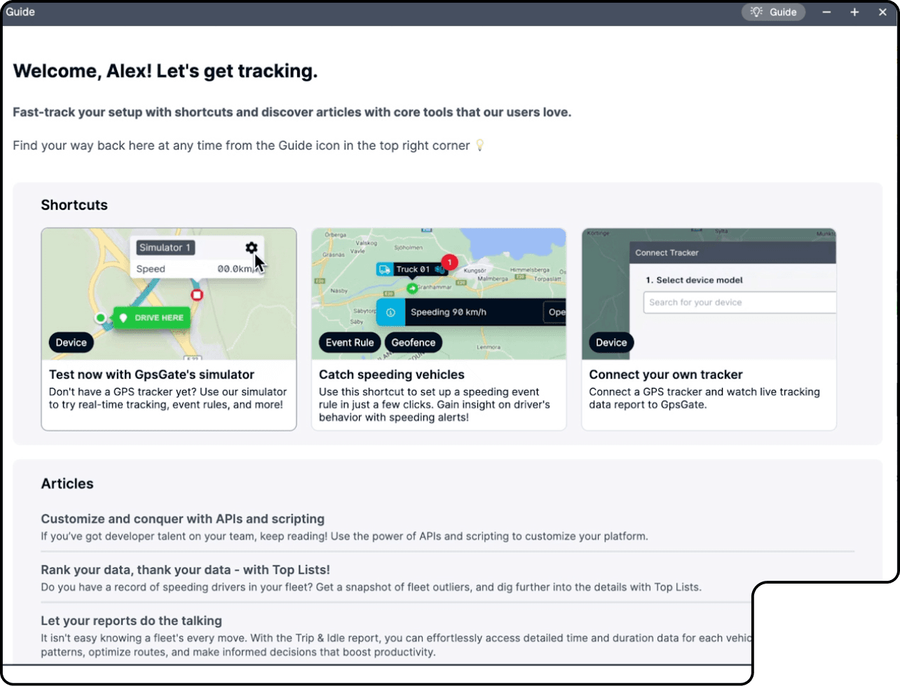 Guide is your in-product helper. With Guide by your side, you can connect a tracker, use our simulator, and discover tips and tricks to up your fleet tracking game! Whether you're a new user to GpsGate, or introducing new customers or teammates to our software, Guide is here to help you hit the ground running!